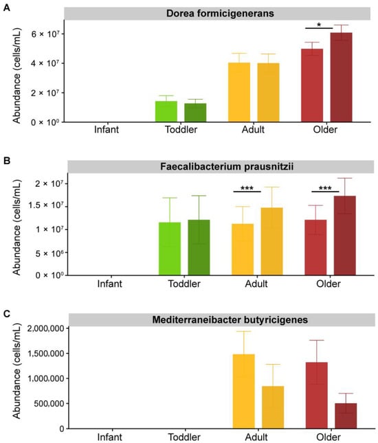 Three taxa as potential butyrate producers, Dorea formicigenerans, Faecalibacterium prausnitzii and Mediterraneibacter butyricigenes, were identified across this system (Figure 6). The most highly correlated with butyrate was Dorea formicigenerans (Spearman r = 0.9, q = 3.55 × 10−14), which was significantly increased in the older group after the SSP treatment. Another butyrate producer, Faecalibacterium prausnitzii, also significantly increased in abundance following the SSP treatment in the older adult and adult groups. Mediterraneibacter butyricigenes was lower in abundance following the SSP treatment but did correlate with butyrate production in the older group, though its abundance was variable across individual samples. While all three of these species are known butyrate producers, the exact contributions of these likely producers, as well as consumers, are not readily determined. These data, once again, show an age-dependent difference in the gut microbial community structure and its function.