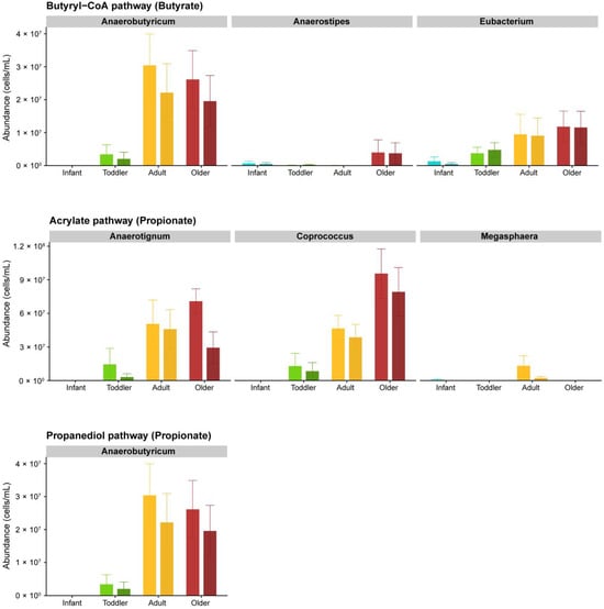 Taxa containing pathways associated with lactate production are shown in Figure 7B, where the major species come from Lachnospiraceae, Clostridiaceae, Bacteroidaceae, and Bifidobacterium. Treatment with SSP showed little or no effect on the richness of species from these genera. Some members of those families are lactate consumers that convert lactate to SCFA. As shown in Figure 7C, Clostridium butyricum, a lactate consumer and butyrate producer, was present only in the infant communities. Lactiplantibacillus plantarum is a lactate producer identified only in adult communities. Another lactate producer/consumer, Lacrimispora, was somewhat more abundant in the adult and older adult groups. Figure 8 shows another set of taxa associated with pathways of lactate conversion, as described previously [32]. The propanediol pathway leads to the conversion of lactate to acetate and 1,2-propanediol [33], the acrylate pathway produces propionate from lactate [34], and butyryl-CoA is the intermediate of butyrate from lactate conversion [35]. All those taxa are more concentrated in the adult and older adult groups; the next abundant group is the toddler group, regardless of SSP treatment.