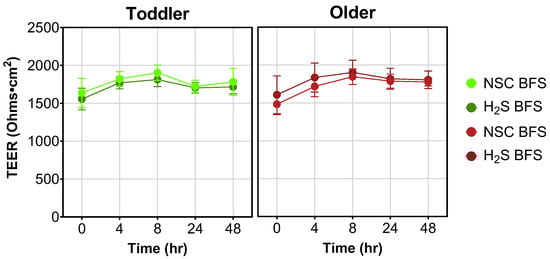 Finally, we investigated the effects of bacteria-free supernatants from the fecal incubations on colonoid cells in vitro. The question here was if alterations to microbial metabolism as a result of SSP addition could generate metabolites that may impact the intestinal epithelium. The intestinal epithelium interacts with the gut microbiota and serves as a barrier, preventing harmful substances from entering the body, while also regulating nutrient absorption [70,71]. H2S has been demonstrated to have a protective effect on intestinal epithelial barrier function in both in vivo and in vitro studies [14,72]. Given this, we wanted to know whether the addition of SSP in our experiment would also have an effect on the barrier function of colon cells grown in vitro. As shown in Figure 9, there was no difference in the TEER values between the two treatments, indicating that the SSP treatment at the present dose did not impact the barrier function of the monolayer compared to the control. From this data, we can conclude that the dose of SSP used in this study did not alter the microbial community of the toddler or older adult groups in a way that positively or negatively impacted barrier function.