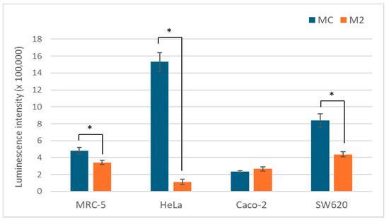 ATP levels in MCF-5, HeLa, Caco-2, and SW-620 cells cultured in MC or M2 medium after 72 h. All values (N = 12) are presented as average (±SD). Statistical analysis was performed using one-way ANOVA with Bonferroni correction; (*) indicates a statistically significant difference compared with control (p < 0.05).