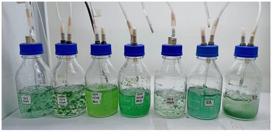 Each strain was grown in 500 mL clear borosilicate flasks with a working volume of 300 mL on BG11 medium [55]. The medium was agitated by air injection at a flow rate of approximately 180 mL/min, using a mixture of 1% (v/v) filtered CO2, an irradiance of 100 μmol m−2 s−1, and a 12 h light/12 h dark photoperiod for 20 days (Figure 1). At the end of the culture time, the flasks were disconnected from the airflow and allowed to decant for 1 h. The medium was centrifuged at 2054× g for 20 min (20 °C). The cell-free medium was used to determine EPS and Indole-3-Acetic Acid (IAA).