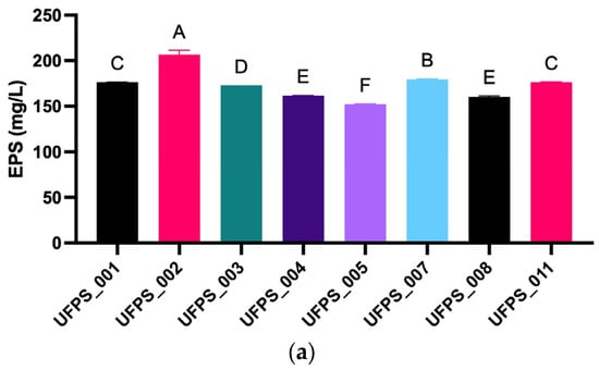 The data obtained were analyzed using one-way ANOVA followed by Dunnett’s multiple comparisons test, which was performed using GraphPad Prism version 10.4.1 (GraphPad Software, San Diego, CA, USA) to identify significant differences in EPS and IAA production among the strains.