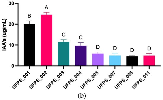 IAA also varied greatly in final concentration across strains (p < 0.05), with final concentrations ranging from 6 to 28 μg/mL. Nonetheless, UFPS_002 was again found to have the highest IAA output (28 μg/mL), which was statistically superior to that of all other strains. UFPS_001 came next at 24 μg/mL, and all other isolates produced less, with UFPS_005, UFPS_007, UFPS_008, and UFPS_011 clustering with the least production; 6–8 μg/mL (Figure 3b). Since it produced more EPS and IAA than all other isolates, UFPS_002 was considered more relevant to the application of biotechnology in processes involving crop biofertilization and stress mitigation. The difference in metabolite production suggests that genetic and physiological differences likely modulate strain-specific regulatory mechanisms.