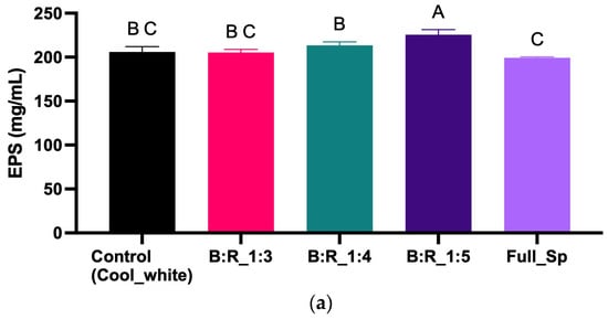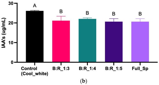 The effect of LED light spectrum on extracellular polymeric substances (EPS) and indole-3-acetic acid (IAA) formation was examined by comparing cool white (CWL) with different blue:red (B:R) light treatments and full-spectrum treatment (Full_Sp). Light quality significantly affected EPS production (Figure 3a; p < 0.05). The highest EPS concentration was observed at a B:R ratio of 1:5 (230 mg/mL), which was significantly higher than that of the control and other treatments. Intermediate EPS levels were recorded under B:R 1:3, B:R 1:4, and the control, while the Full_Sp treatment resulted in the lowest EPS yield, statistically grouping with the control.