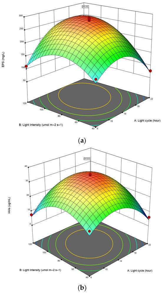 The newly introduced findings from this study further reinforce the significance of manipulating the light regime. Response surface methodology (RSM) provided statistically robust models with high predictive accuracy for EPS and IAA production. The adjusted R2 and predicted R2 values were closely aligned (EPS: 0.9826 vs. 0.9382; IAA: 0.9937 vs. 0.9838), indicating a reliable fit to the observed data. Moreover, the models’ lack of fit was non-significant for both metabolites, confirming the adequacy of the selected light variables in shaping metabolite synthesis.