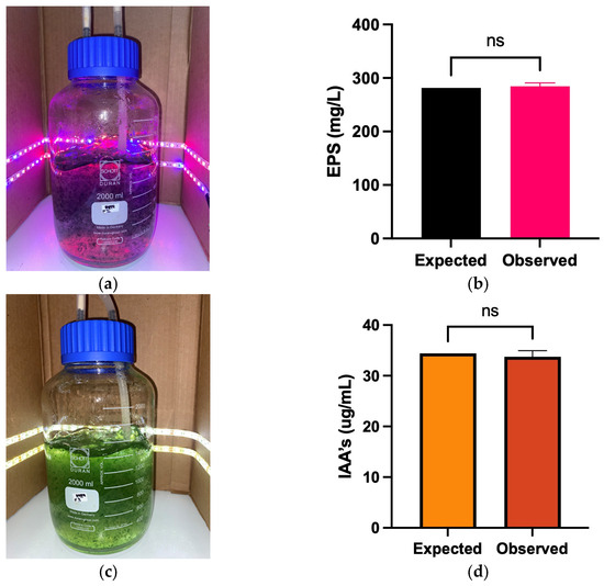 By applying desirability criteria in Design-Expert software, the optimal experimental conditions for maximizing the production of exopolysaccharides (EPS) and indole-3-acetic acid (IAA) were established (Table 3). These conditions were tested using a 2 L GL80 flask with a working volume of 1200 mL. The medium was agitated by air injection at an approximately 180 mLair/min flow rate. The strain was cultured under Blue:Red and had the light intensity irradiance of 100 μmol m−2 s−1 and a 12:12 h light–dark cycle for 20 days (Figure 5). At the end of the culture time, the flasks were disconnected from the airflow and allowed to decant for 1 h. The medium was centrifuged at 2054× g for 20 min (20 °C). The cell-free medium was used to determine EPS and IAA. It is worth noting that the desirability functions were defined separately for each metabolite. Both EPS (Z1) and IAA (Z2) were assigned a “maximize” goal, with the lowest experimental value as the lower bound and the highest predicted value as the target. Because preliminary trials revealed a metabolic trade-off between the two pathways, no composite desirability was constructed; instead, two independent optimizations were performed. Table 3 presents the optimal light regime obtained for each metabolite individually.
