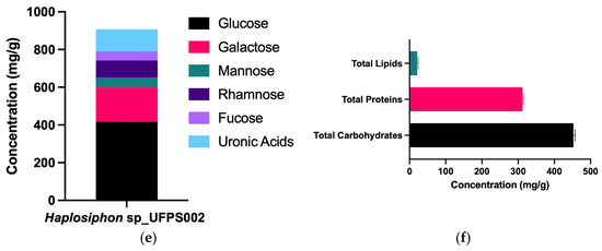 Figure 5e,f illustrate the biochemical makeup of the EPS generated by Hapalosiphon sp. UFPS002. Figure 5e illustrates that glucose (416 mg/g) and galactose (183 mg/g) were the predominant monosaccharides, accompanied by modest concentrations of rhamnose (91 mg/g), uronic acids (116 mg/g), mannose (52 mg/g), and fucose (49 mg/g), signifying a structurally varied EPS. Figure 5f delineates total biochemical fractions, highlighting carbs as the predominant component (average: 453 mg/g), followed by proteins (312 mg/g) and a negligible fat content (21 mg/g). The elevated levels of carbohydrates and uronic acids indicate promise for bioadhesive or metal-chelating uses.