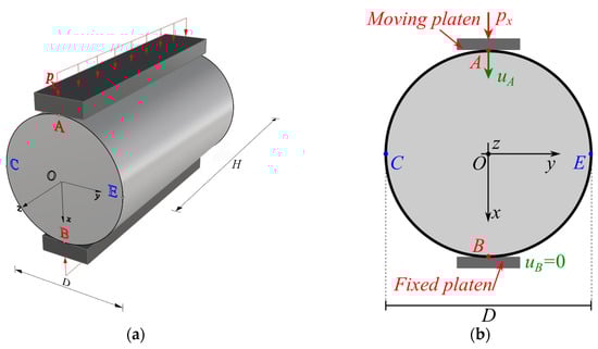 Initially, contact between the platen and the specimen is produced in a unique contact line. Because of the finite elastic moduli of the involved materials, increments in the load application during test execution cause contact to evolve from a line to an area. Although the specimens are straight cylindrical elastic solids, the analytical approach to the problem can be stated in terms of plane elasticity if the contact stresses are uniformly distributed along the longitudinal direction []. Hence, a three-dimensional elastic problem is usually converted into a two-dimensional problem, simplifying its mathematical treatment.
