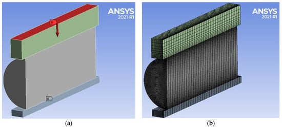 FEM in ANSYS: (a) adopted geometry; (b) adopted mesh.