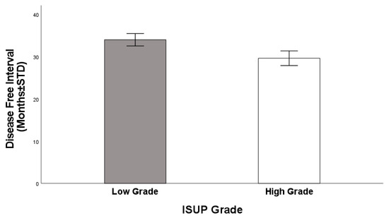 Differences in DFI among grading groups by ISUP consensus recommendations. Low-grade group included grades 1, 2, and 3 by ISUP; high-grade group included grades 4 and 5 by ISUP. High-grade PC showed significantly higher probability of having shorter DFI (p < 0.05).