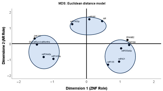 Multidimensional Scaling (MDS) map of the association among the target genes (ZNFs and AR) and related miRNAs. Three clusters are indicated on the map by the circles. Overall survival (OS) was grouped with ZNF747 and two miRNAs (left group). On the opposite side of the map, ZNF700 and ZRANB2 were grouped with three miRNAs (right group). The last group consisted of AR and two miRNAs (upper group). Given the configuration of the variables entered in the analysis, the two new dimensions were named ZNF and AR roles.