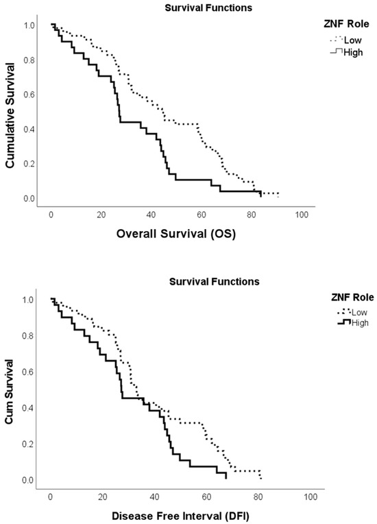 Kaplan–Meier curves of the first dimension, ZNF role, which were revealed by the MDS analysis. The curve showed a higher OS (upper panel) and DFI (lower panel) in patients with low levels of ZNF role expression in comparison to patients with high levels (p < 0.05 for both clinical outputs).