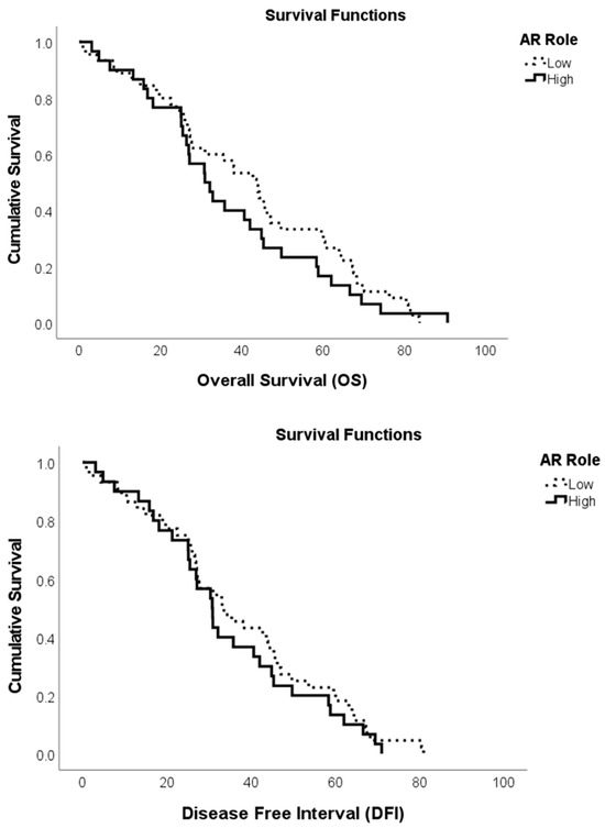 Kaplan–Meier curves of the second dimension, AR role, which were revealed by the MDS analysis. The survival curves were significantly different for either OS (upper panel) or DFI (lower panel) in patients with low levels of AR role expression in comparison to patients with high levels (p < 0.05 for both clinical outputs).