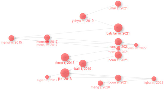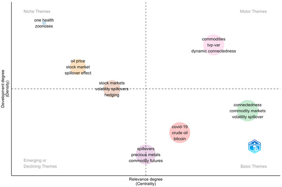 The thematic map analysis (Figure 2) reveals four distinct research quadrants based on the density and centrality of topics within the commodity connectedness literature. The upper-right quadrant, characterized as “Motor Themes,” demonstrates the highest relevance and development density, featuring core concepts including “commodities,” “tvp-var,” and “dynamic connectedness.” This cluster represents the most mature and central research area, indicating substantial scholarly attention and methodological sophistication. The prevalence of TVP-VAR methodology within this quadrant aligns with our literature review findings, where TVP-VAR appear [15,16,29], establishing it as the dominant analytical framework for examining dynamic relationships in commodity markets. The positioning of “volatility spillover” and “connectedness” as central themes corroborates empirical evidence that spillover analysis has become fundamental to understanding market interdependencies, particularly during crisis periods [25,37].