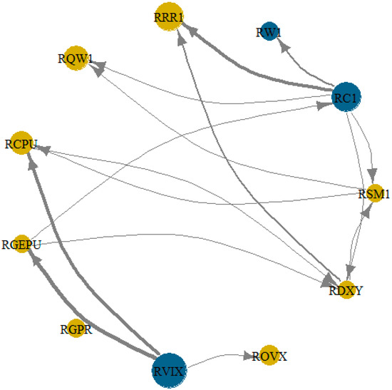 This visual configuration confirms the structural findings from Table 4. Corn (RC1) and RVIX exhibit strong outward spillovers toward commodities, such as rough rice (RRR1), and macro-financial indicators, respectively. Similarly, RDXY shows multiple outbound links, consistent with its sizable “TO” value. In contrast, variables like RQW1 (sugar), ROVX (oil volatility), and RGPR (geopolitical risk) exhibit fewer and thinner outbound arrows, highlighting their relatively passive roles. The figure thus reinforces the asymmetrical transmission structure under climate and policy uncertainty, emphasizing the centrality of financial stress (RVIX), exchange rate fluctuations (RDXY), and staple crops in shaping volatility contagion across the system.