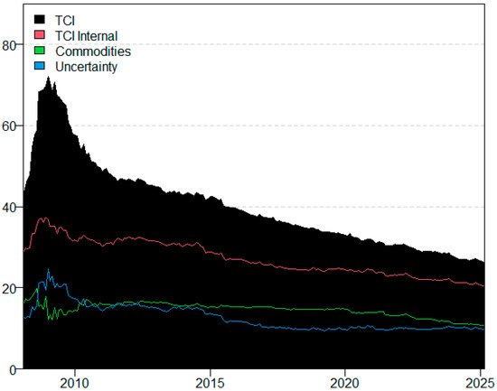 The analysis spans the period from January 2008 to March 2025, based on the availability of the CPU Index, yielding 206 monthly observations. The 2025 data only extend through March due to the limited release of updated uncertainty indices at the time of writing. Given the model’s time-varying structure and the smoothing effects of the Kalman filter, the early truncation of 2025 does not significantly bias the results or affect their robustness. Moreover, the main conclusions are drawn from long-term dynamics and multiple episodes of external stress over the 2008–2024 period.