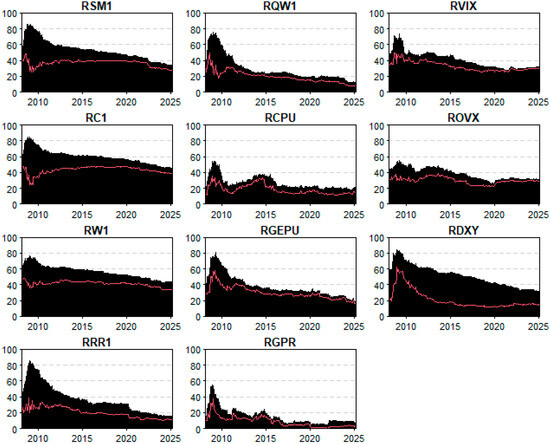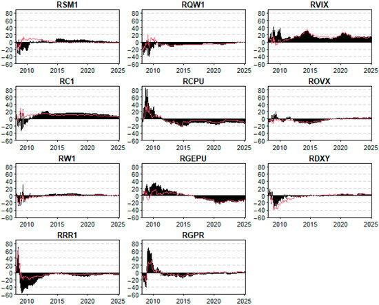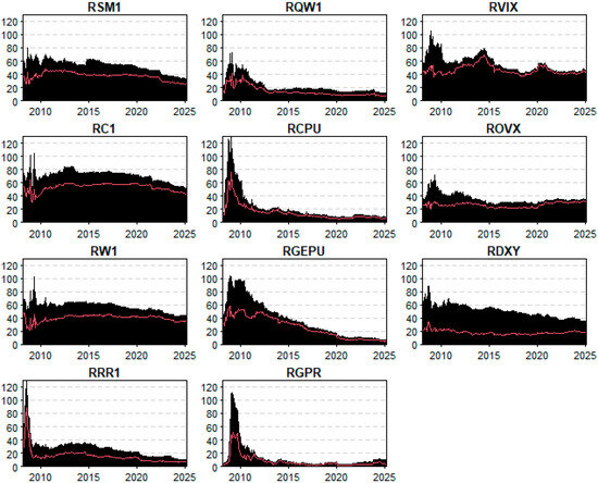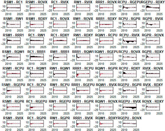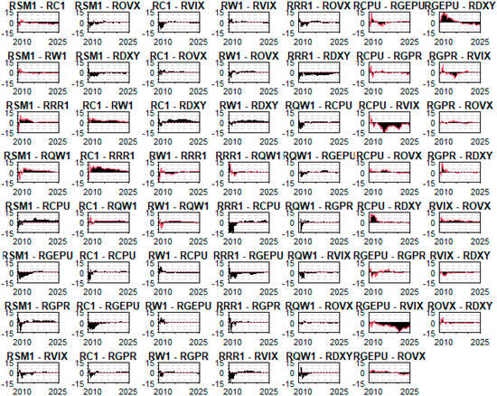 The skewness and excess kurtosis measures reveal significant non-normality in many series. For instance, soybean (RSM1) and corn (RC1) exhibit significant left skewness, while RVIX shows extreme right skewness (1.283, p < 0.01), suggesting a high frequency of large positive shocks, typically observed during periods of market stress. High kurtosis values, especially for RVIX and RGEPU, further indicate the presence of fat tails, highlighting susceptibility to extreme values.