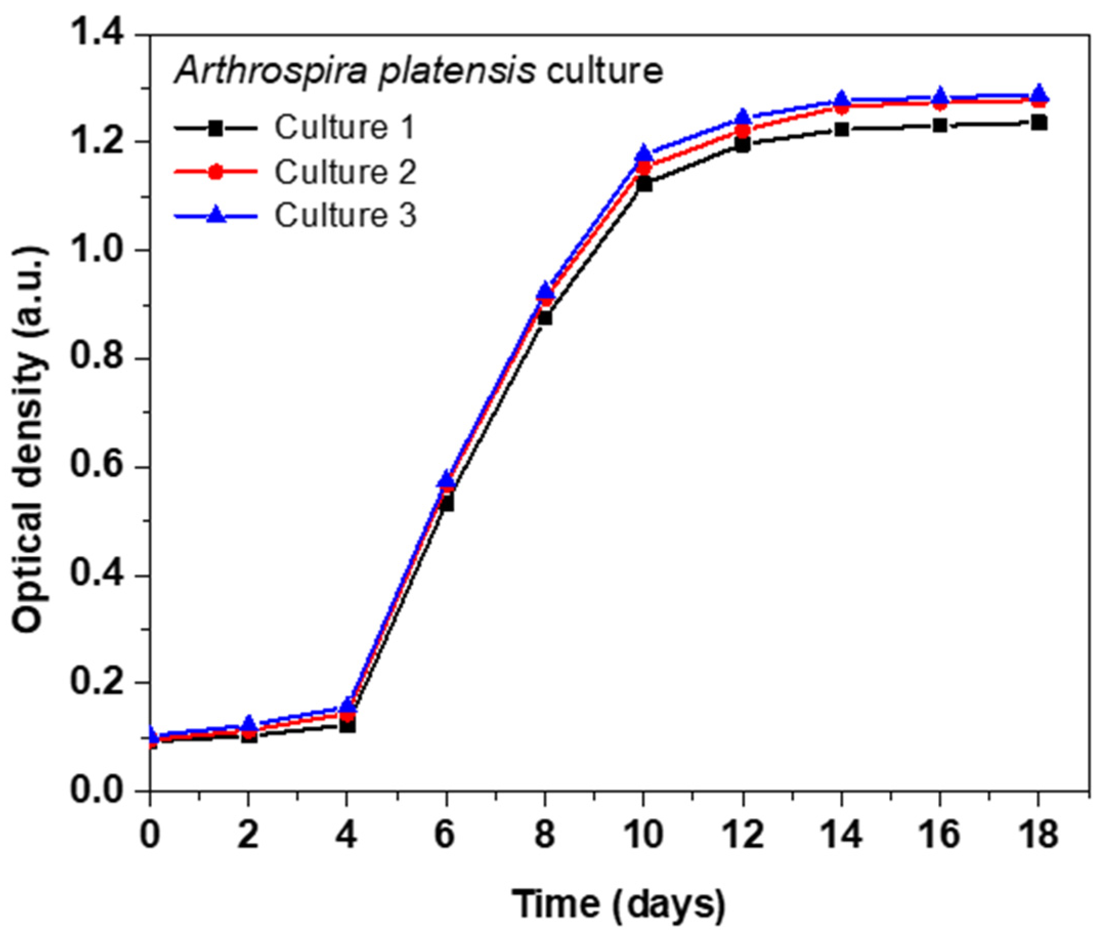 - Sergeeva, Y.E.; Sukhinov, D.V. Influence of Inoculum Age on the Growth and C-Phycocyanin Accumulation in Arthrospira platensis Cyanobacteria. Nanobiotechnol. Rep. 2023, 18, 33–38. [Google Scholar] [CrossRef]