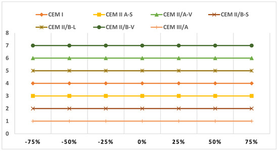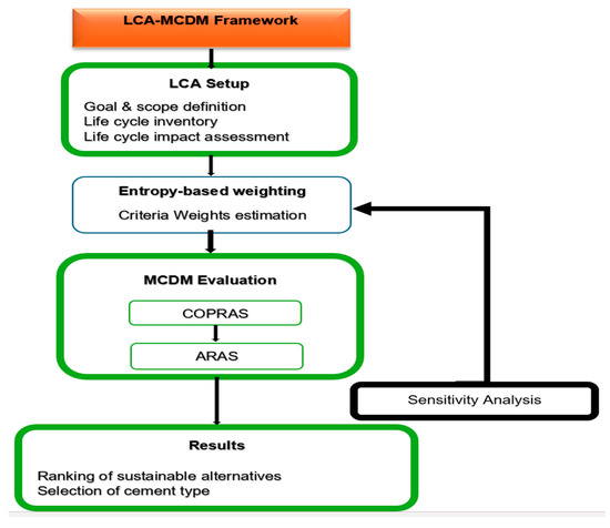 Several approaches have been proposed to mitigate the environmental impact of cement production. One effective method is to substitute industrial waste materials with alternative raw materials and fuel sources [25,26,27,28,38]. This method reduces the consumption of natural resources and lowers GHG emissions [13]. Additionally, the development of novel cementitious materials has shown improvement by incorporating waste-based components, which reduce the overall carbon footprint of cement production [29]. Transitioning to sustainable cement production requires integrating LCA-driven insights methods with pragmatic policy and industrial innovation. The integration of LCA and multi-criteria decision-making (MCDM) methods is crucial for ranking and evaluating different cement types. The MCDM is a set of techniques used to assess and prioritize alternatives by integrating multiple conflicting criteria to support complex decision-making and identify the most suitable alternative [39,40].