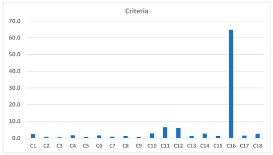 The decision matrix (Equation (4)) is a matrix table that outlines the assessment criteria for each alternative within the decision-making process. This matrix incorporates both qualitative and quantitative values, offering a comprehensive summary of each alternative’s attributes and thereby streamlining informed decision-making. For each alternative and criterion , the normalized decision value is given by (Equation (4)).