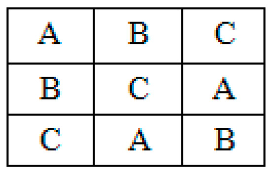 Figure 1. This example uses the letters of the Latin alphabet (A, B, C) as symbols to construct the square [