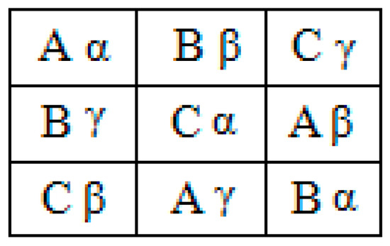 14]. This pair was constructed by the superposition of two Latin squares, one square containing Latin letters (A, B, C) and the other constructed with Greek letters (α, β, γ).