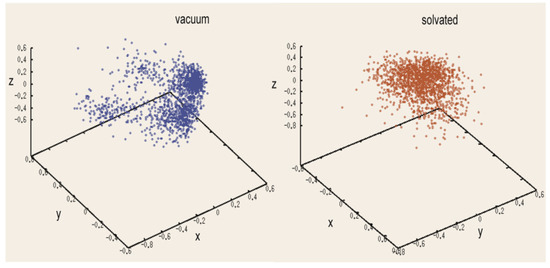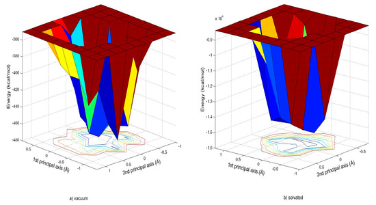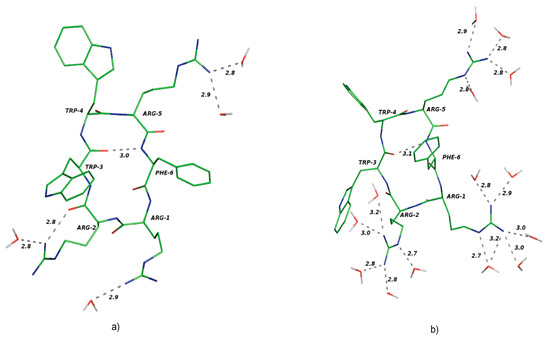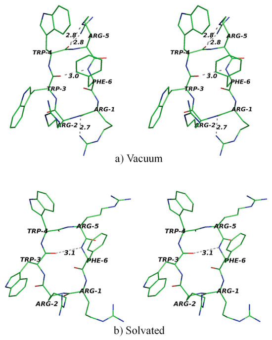 17] to explore both environments. We added explicit water molecules to each of the defined n2 MOLS conformations by placing a solvent box using the VMD program. We solvated the peptide using TIP3P water molecules, extending the water approximately 10 Å in each direction from the molecule’s ends. When the side chains of the peptide were in or out of plane, it was ensured that the solvent molecule always covered them. After this, we calculated the conformational energy of the peptide structure using the CHARMM22 potential [