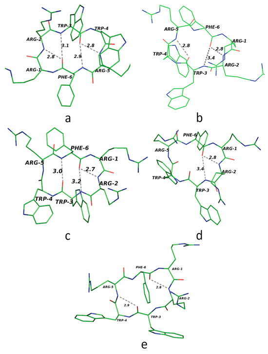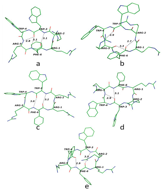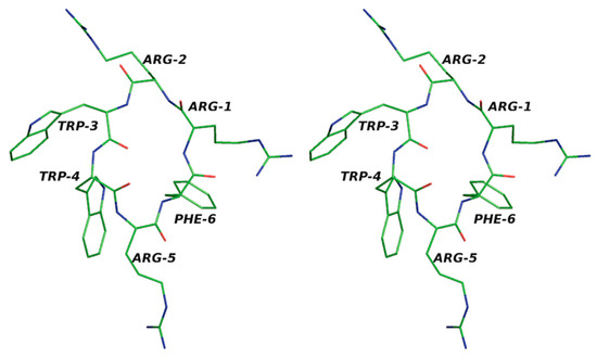 We investigated the cyclic hexapeptide of an antimicrobial peptide with the sequence RRWWRF in the current study. Here, the amino acid residues do not have similar patterns, and so we took this as a test case. We used the solved NMR structure from the PDB databank with id 1QVL [