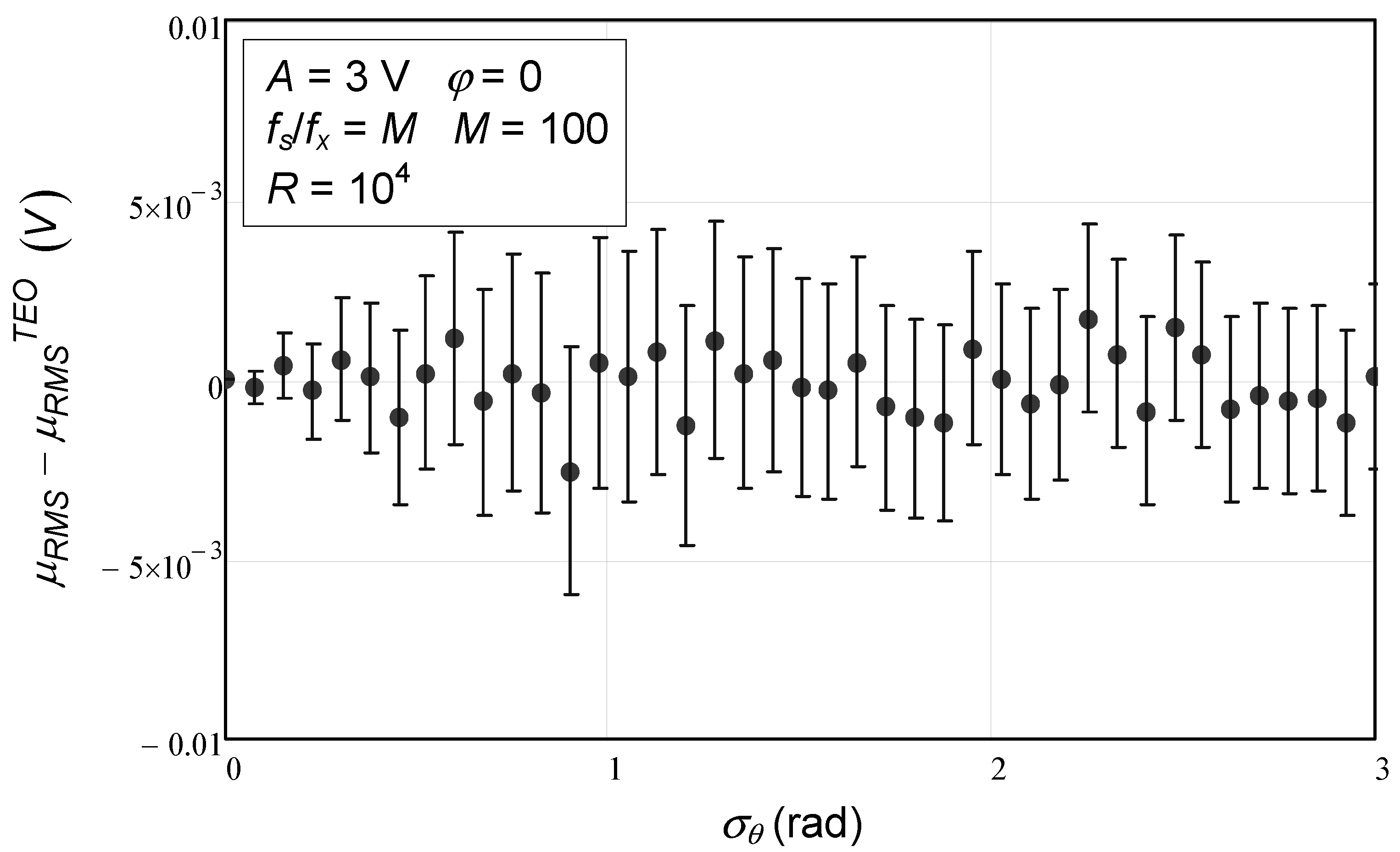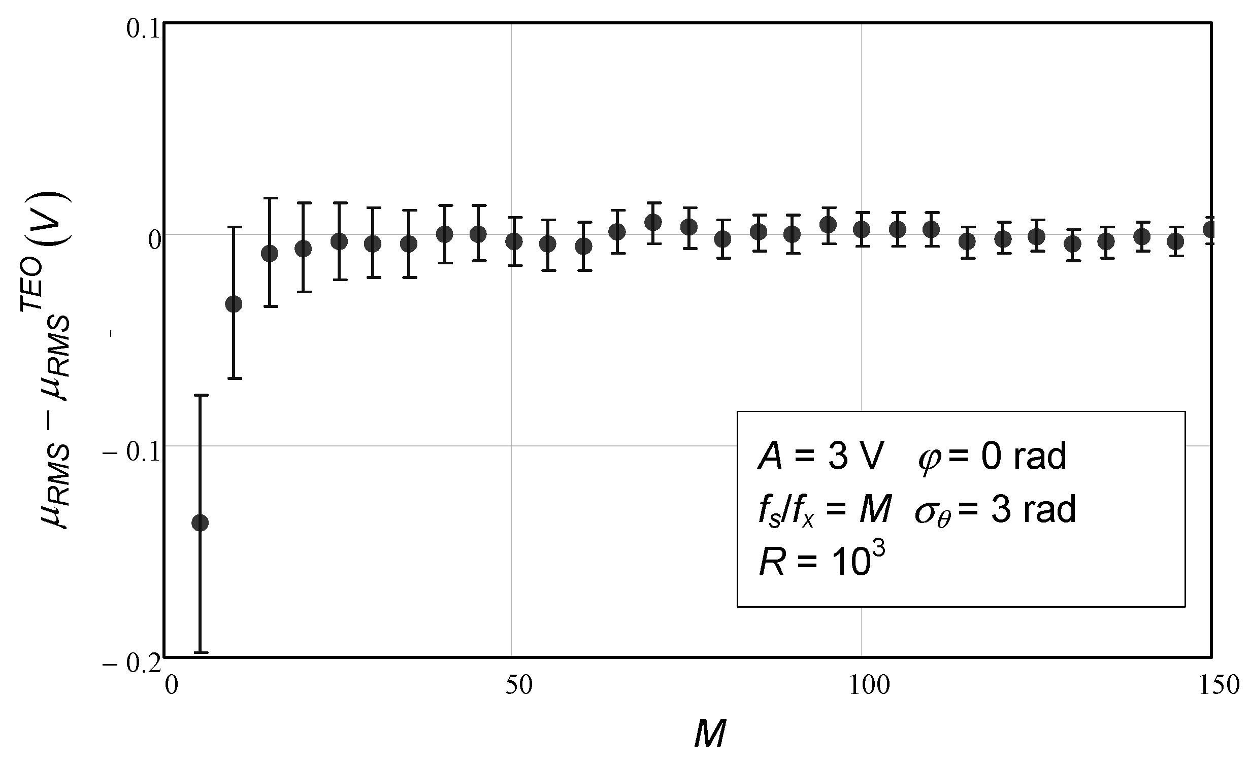 Figure 9, we observe the linear behavior provided by the analytical expression for the dependence of the mean value of the estimated residual RMS as a function of sinusoidal amplitude, as expressed by Equation (116). Again, for the number of repetitions used,