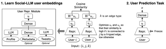 The user representation module mainly takes place in the pre-trained LLM model to be applied to the user’s profile description. This LLM model is trainable in order to allow for fine-tuning in our training process. If user metadata features and/or the averaged LLM embeddings of the user tweets are provided, they will be directed through a series of dense layers. We concatenate these outputs into one single embedding and apply another dense layer to produce a single d-dimensional embedding for user i.
