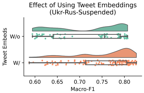 Effect of adding user tweet embeddings on the Ukr-Rus-Suspended dataset (Experiment 5). The distributions of Macro-F1 scores across runs are shown for models trained without tweet embeddings (top, green) and with tweet embeddings (bottom, orange). Models with tweet embeddings achieve consistently higher Macro-F1, with an average improvement of 4%.