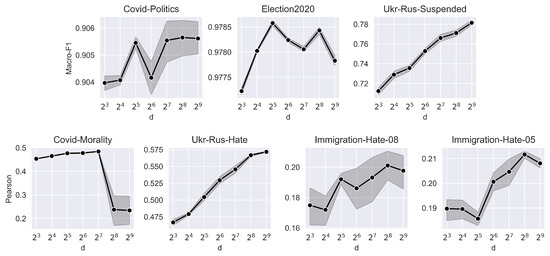 For every dataset and its corresponding set of user embeddings, we conducted the same train–test procedure repeated 10 times, splitting the dataset randomly using 10 pre-selected random seeds. Unless otherwise indicated, we used a 60%–20%–20% train–val–test split. The validation sets are used for early stopping and for model selection. The model architecture and hyperparameters are fixed for all experiments: batch size = 32, learning rate = , number of epochs = 10, hidden dimension = 32, number of dense layer = 1. We also applied early stopping if the epoch’s loss stops improving. The classification tasks were evaluated using Macro-F1, and the regression tasks were evaluated using Pearson’s correlation. For regression tasks with multiple labels, we averaged the Pearson’s correlation across labels.