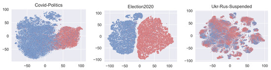 Research Question. When the Ukraine–Russian war erupted in early 2022, social media quickly became a platform to spread content about the conflict, not all of which was truthful. Early research suggests that Russian mis/disinformation campaigns, state-sponsored content, and otherwise suspicious activities were rampant on social media [53,54]. We used a real-time collection of tweets about the conflict [55] for a full month in March 2022. Many of these users who tweeted about the war were since suspended by Twitter, (see Twitter’s help page on account suspension: https://help.twitter.com/en/managing-your-account/suspended-x-accounts (accessed on 29 September 2025)) and they were often found to be newer, more active (spamming), and more toxic than users that were not suspended [56]. We theorize that suspended users and normal users reflect different communication characteristics due to different agendas, motivations, and needs from social media.