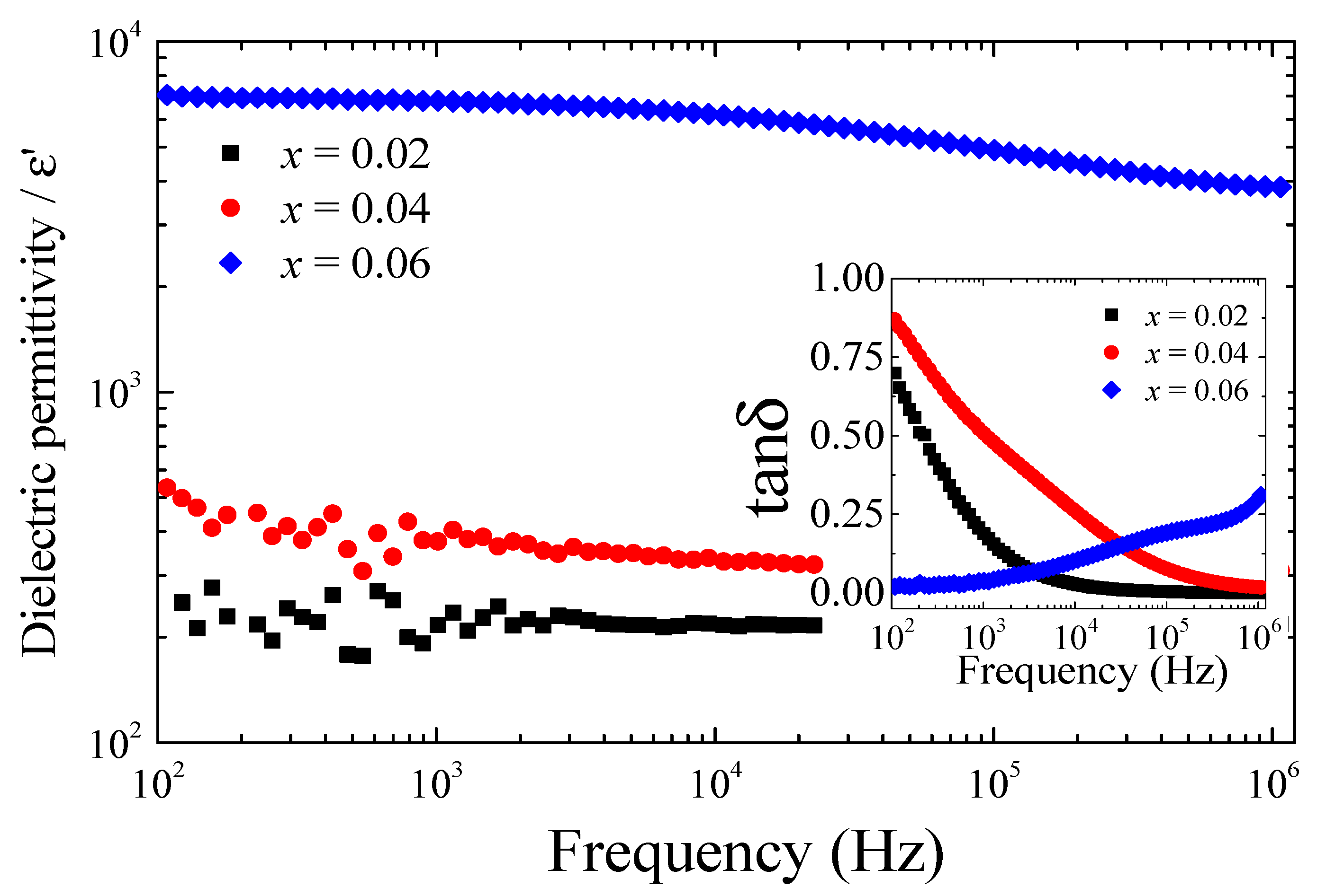 x = 0.06, ε′~6780 at 1 kHz and tanδ ~0.038 with only weak dispersion up to 10