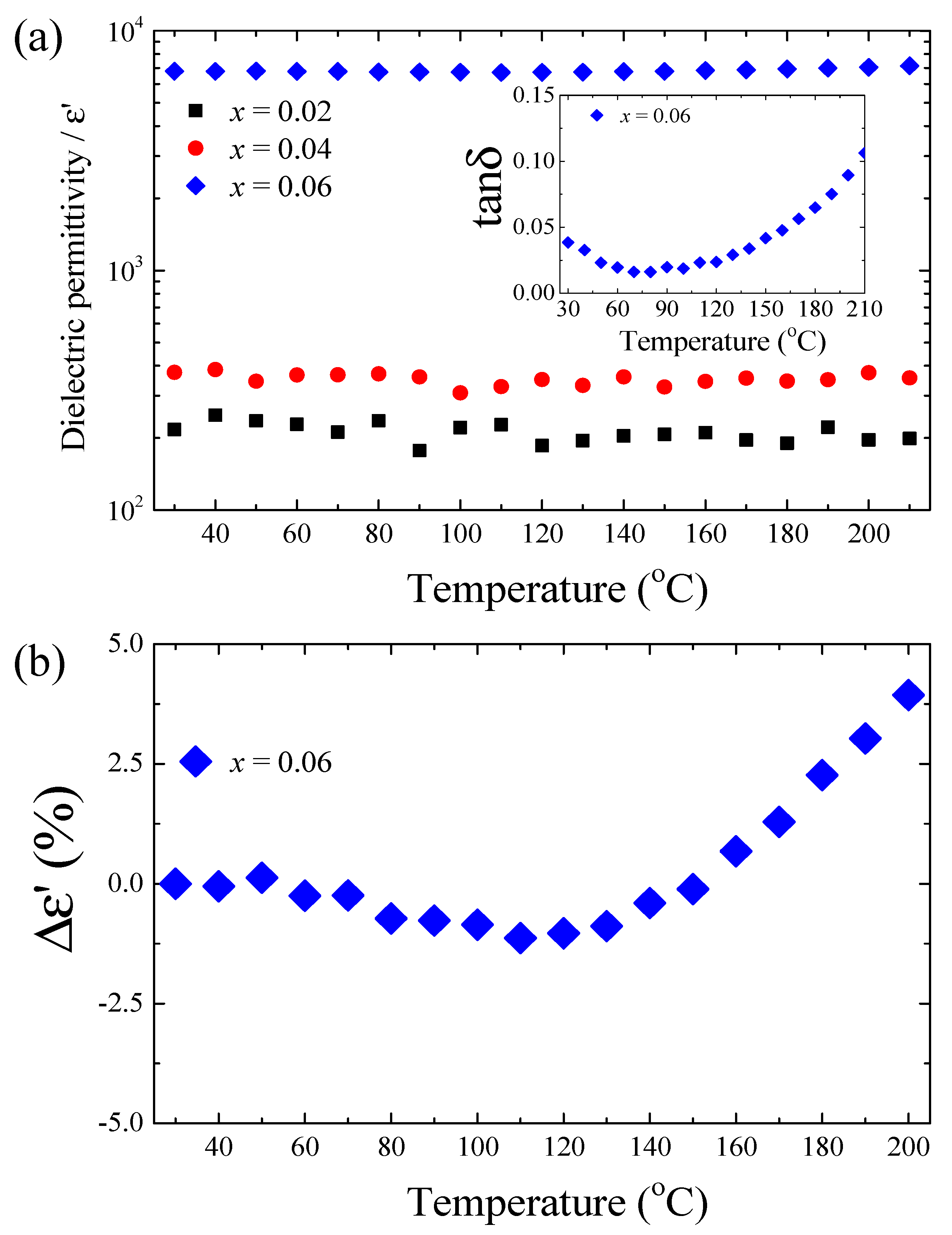x = 0.06 demonstrates remarkable dielectric performance, combining high ε′, consistently low tanδ, and outstanding temperature stability. As summarized in