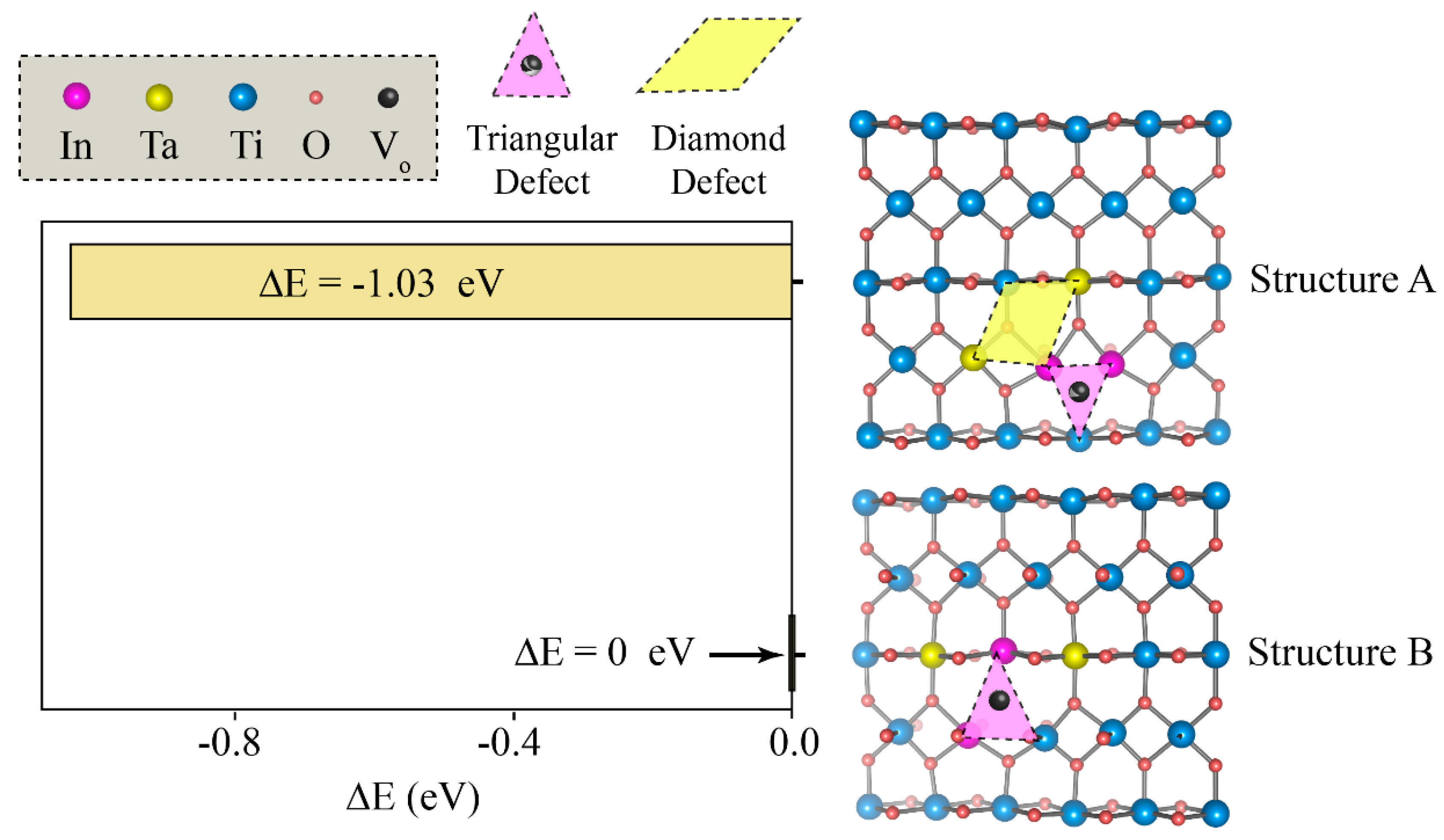 To investigate whether the point defects identified by XPS assemble into stable electron-trapping clusters, we performed DFT calculations to compare the stability of two defect configurations: Structure A and Structure B. Structure A consists of a triangle-diamond cluster linking an