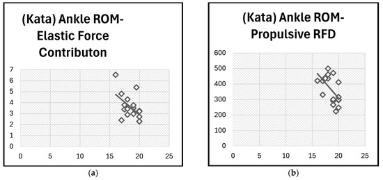 Pearson Correlation Results Kata Group. (a) Linear Regression between Kata Ankle ROM (cm) and Elastic Force Contribution (cm). (b) Linear Regression between Kata Ankle ROM (cm) and Propulsive RFD (kg/s).