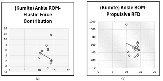 Results of the Pearson correlation with Kumite. (a) Linear Regression between Kumite Ankle ROM (cm) and Elastic Force Contribution (cm). (b) Linear Regression between Kumite Ankle ROM (cm) Propulsive RFD (kg/s).