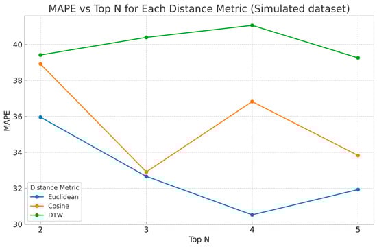 The MAPE is plotted across the number of Top N and distance metrics—Euclidean distance (blue), cosine similarity (orange), and Dynamic Time Warping (green)—to assess best performing Ns.