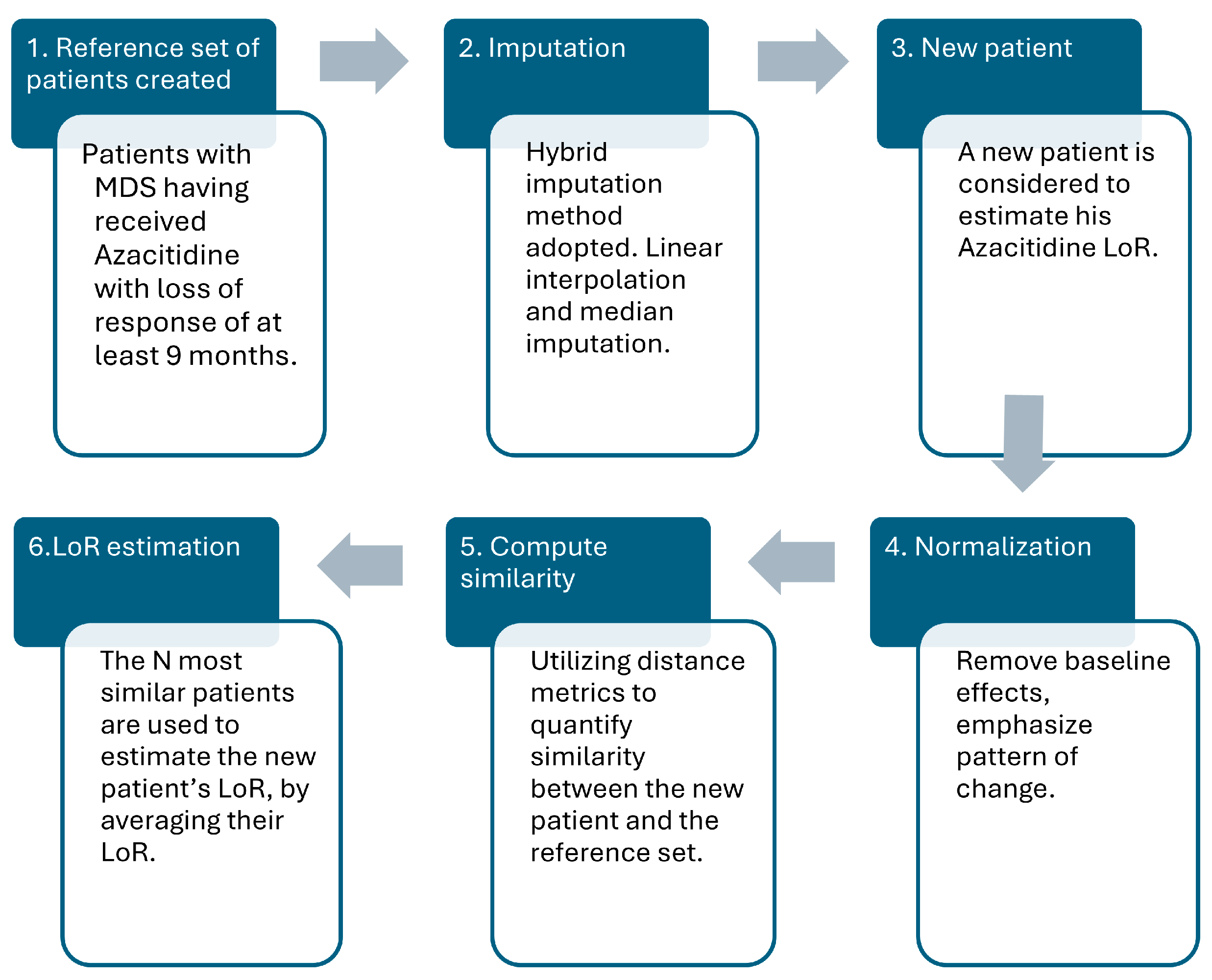 This study proposed a personalized prediction framework to estimate the LoR to azacitidine therapy in MDS patients using an instance-based, similarity-driven approach. Leveraging real-world longitudinal clinical data from 18 patients, along with 300 statistically simulated patients, this study sought to predict the treatment’s LoR early in the treatment timeline. The patient similarity was calculated using three distinct distance metrics–Euclidean distance, cosine similarity, and DTW—and a normalization approach was proposed that emphasized relative changes from baseline to ensure meaningful and accurate comparisons, with the final predictions derived by averaging the LoR of the N most similar patients.