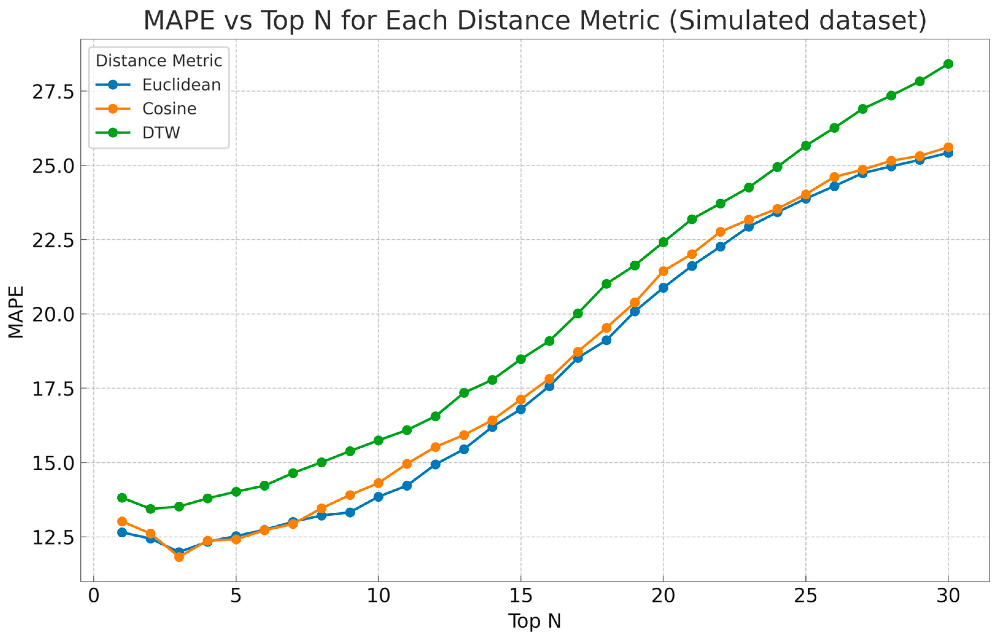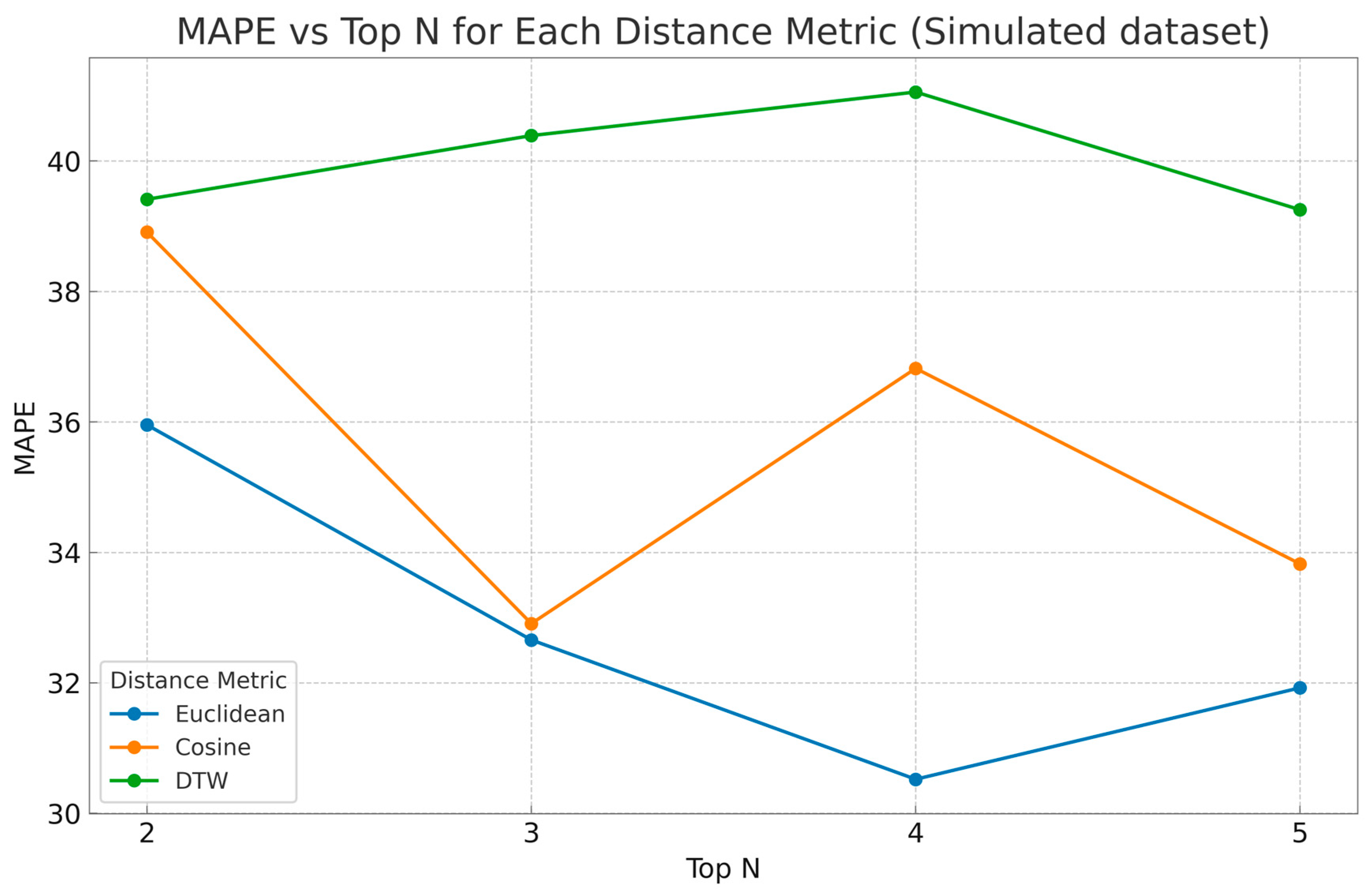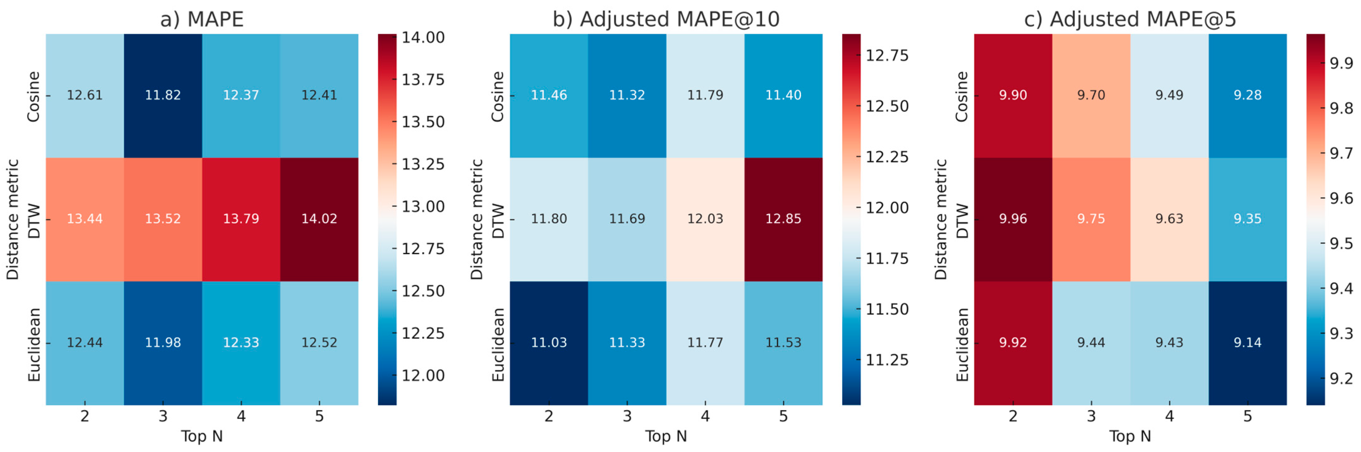 Figure 5, validated the methodological framework, supported the effectiveness of Euclidean and cosine distance, and suggested an optimal Top N in the range of 3 to 5. Specifically, the cosine distance combined with Top N =3 showed promising results with an MAPE of 11.82% (
