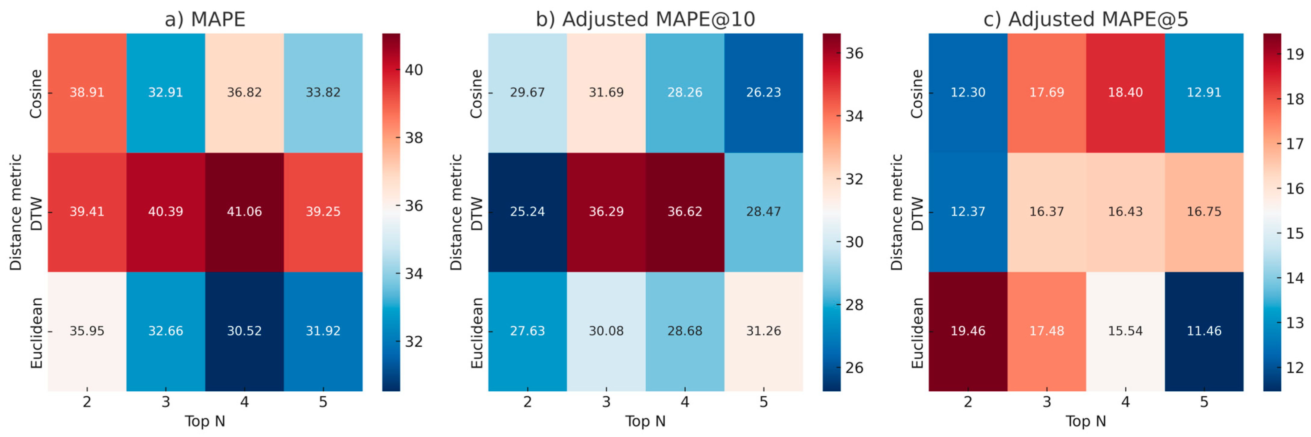 Figure 3a) when using Top N = 4, offered the most consistent and accurate performance under the current framework and dataset. Also, while Top N = 5 seemed to perform a little bit better for adjusted MAPE@5 (