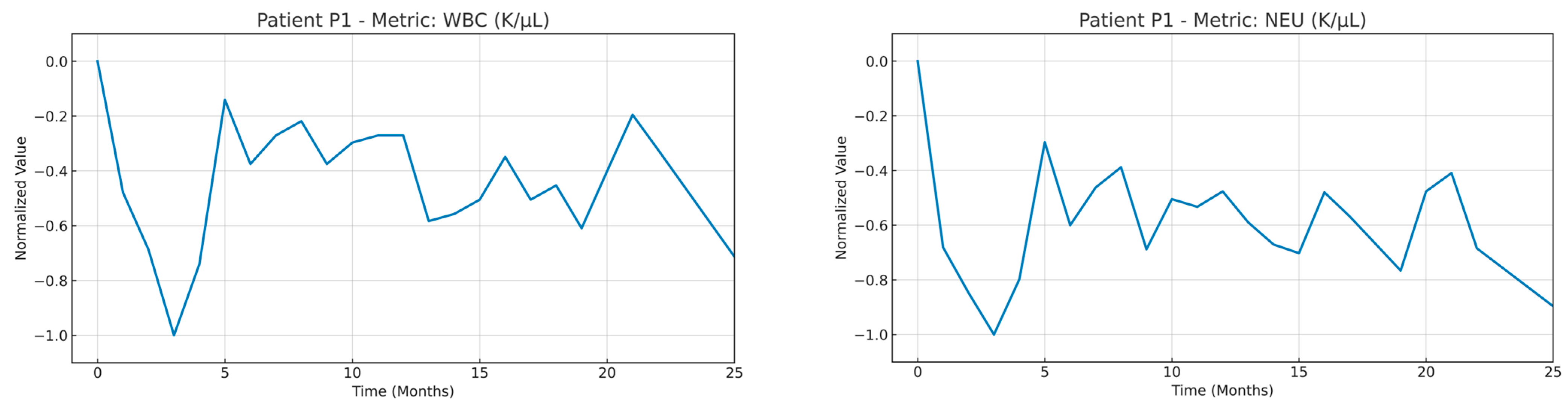 The first value of each clinical measurement (azacitidine treatment initiation) is used as a baseline—treated as 0—and subtracted from all subsequent values. This shifts the entire series so that it begins at zero, and then the resulting series is divided by the maximum absolute deviation from the baseline to rescale the pattern within the range [−1, 1], with ±1 representing the maximum deviation: