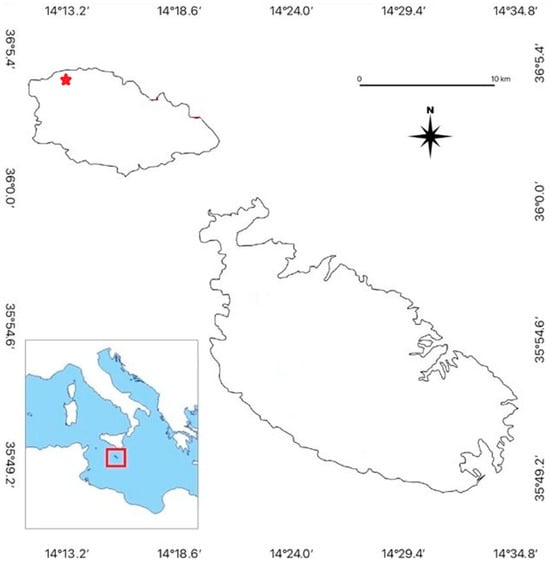 NOx concentration measurements were reported at several stations in the Mediterranean region [,]. At the Lamezia Terme station in Southern Italy, nine years of continuous measurements (2015–2023) [] reveal diurnal and seasonal patterns similar to those observed elsewhere in the Central Mediterranean []. However, the maxima and minima associated with wind speed and wind direction are specific to each station, depending on its location and proximity to local and regional emission sources. Therefore, the aim of this case study is to provide a detailed analysis of NOx variability in relation to wind speed and wind direction, specifically pertaining to the Island of Gozo (Maltese Archipelago).