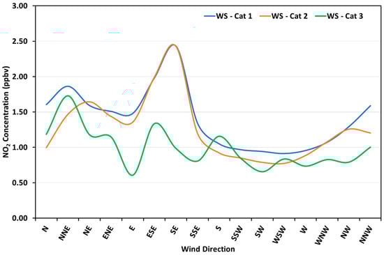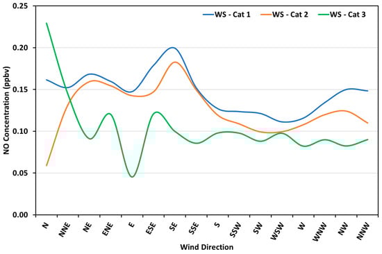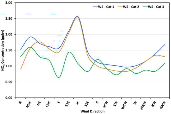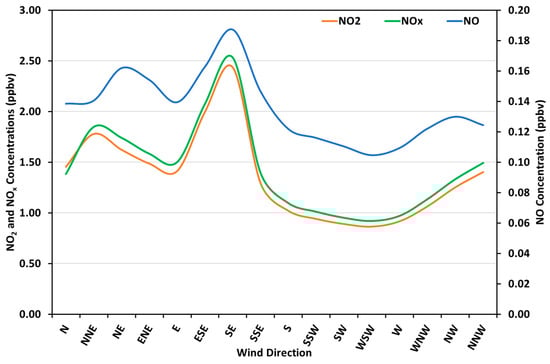 The maxima and minima of pollutant concentrations observed at a given background monitoring station are intrinsic characteristics of the specific monitoring site, reflecting the combined influence of meteorological parameters—such as wind speed and wind direction—and emissions from nearby sources. At the Liossia background monitoring station in Greece [], both NO and NO2 exhibit distinct concentration maxima as a function of wind direction. Specifically, elevated NO levels are associated with northeasterly winds, whereas NO2 concentrations reach their highest values during westerly wind conditions.