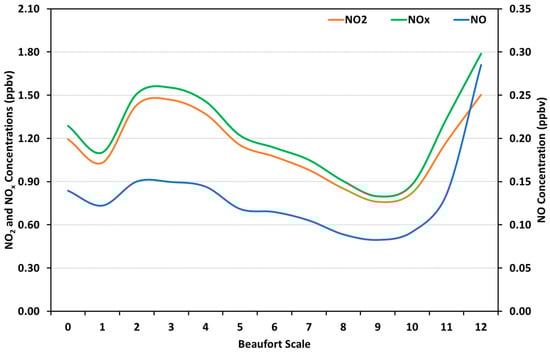 In this study, the Beaufort Scale is used as proxy for wind speed. The usefulness of the Beaufort Scale is that it discretises the parameter by creating categories, which simplifies matters. Figure 3 shows how the average concentrations of the oxides of nitrogen vary with wind speed. The analysis indicates that there is correlation amongst the compounds over the entire scale, except at very high wind speeds. NOx reached a peak concentration during extreme high wind speed events. It is evident that, under these conditions, the Central Mediterranean acts as a receptor for transboundary pollution from Continental Europe. Several modelling analyses confirm the impact of transboundary pollution on the Mediterranean region [,,]. Furthermore, a secondary peak in NOx levels can be noted for the Beaufort Scale range, 2 to 4, which corresponds to the highest frequency of wind speed occurrences. Conversely, the lowest NOx concentrations corresponded to wind force 9. It should also be noted that the source–receptor orientation plays an important role in this matter.