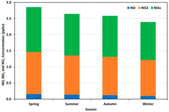It is worth noting that the percentage seasonal variability for NO, NO2, and NOx are 46%, 15%, and 17%, respectively. NO exhibits the greatest variability, being three times greater than that of NO2.