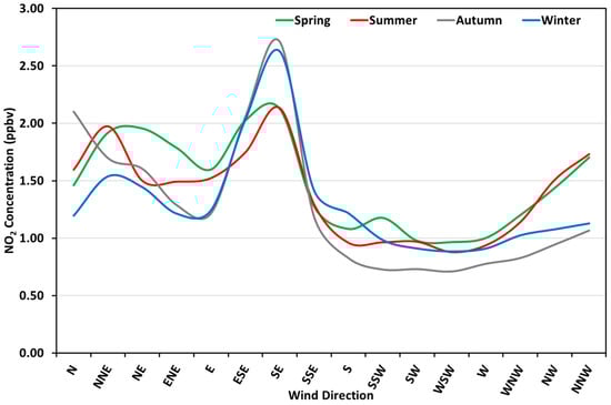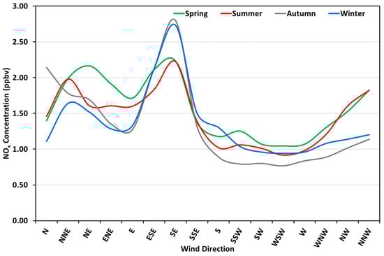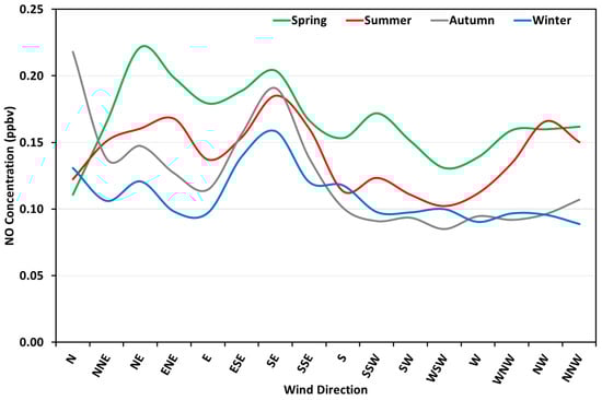 The concentration of NO during the spring and summer seasons was predominant for all wind sectors, with the exception of those cases when the wind originated from the N. In spring, the highest NO concentrations were recorded for winds from the NE, while a secondary peak can be noted in the case of SE winds. Conversely, the lowest NO levels during spring occurred when the wind originated from the N. In the case of the other three seasons, the peak NO concentration is associated with the SE, whereas a significant minimum occurred when the wind blew from the S–W sector.
