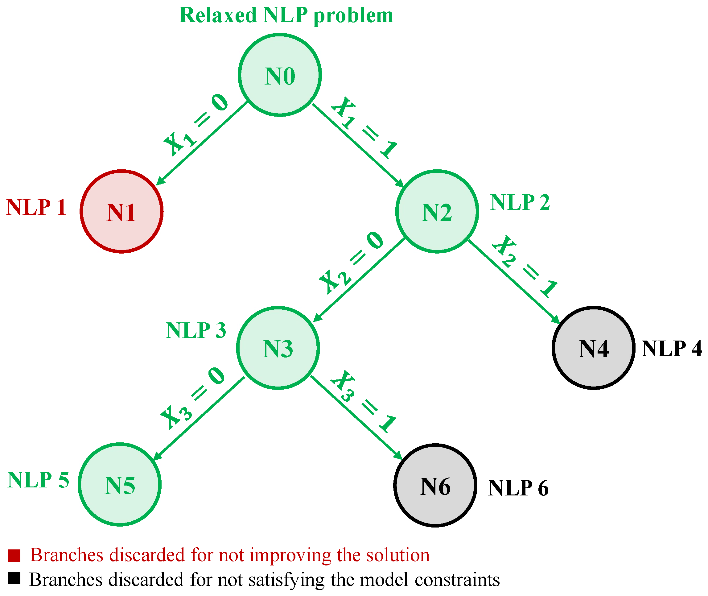 - Bounding and pruning. Compare node lower bounds with the incumbent objective. Fathom nodes that cannot improve the incumbent. Continue branching on promising nodes according to the node-selection policy.