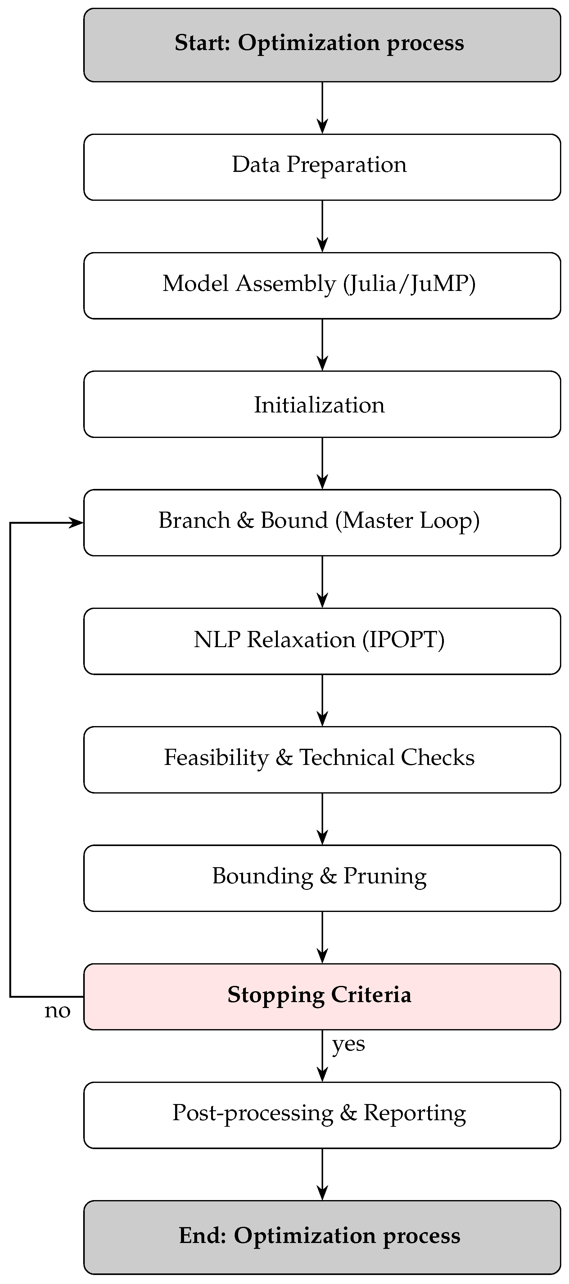 - Initialization. Set variable domains (binary routing/conductor choices; complex ), default bounds, and solver tolerances (optimality gap, feasibility). If an incumbent is available, initialize it.